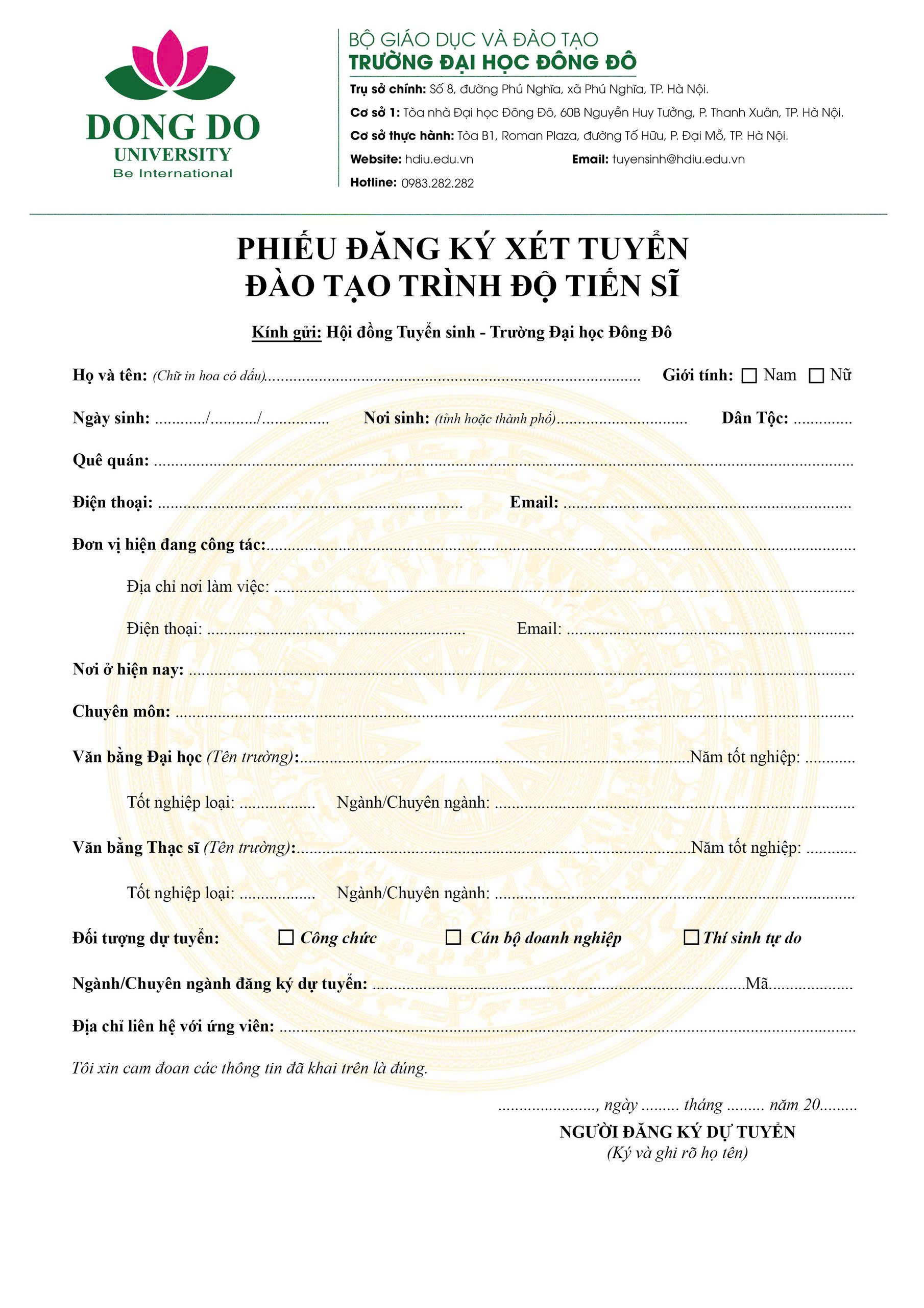 Phiếu Đăng ký Xét tuyển Đào tạo trình độ Tiến sĩ