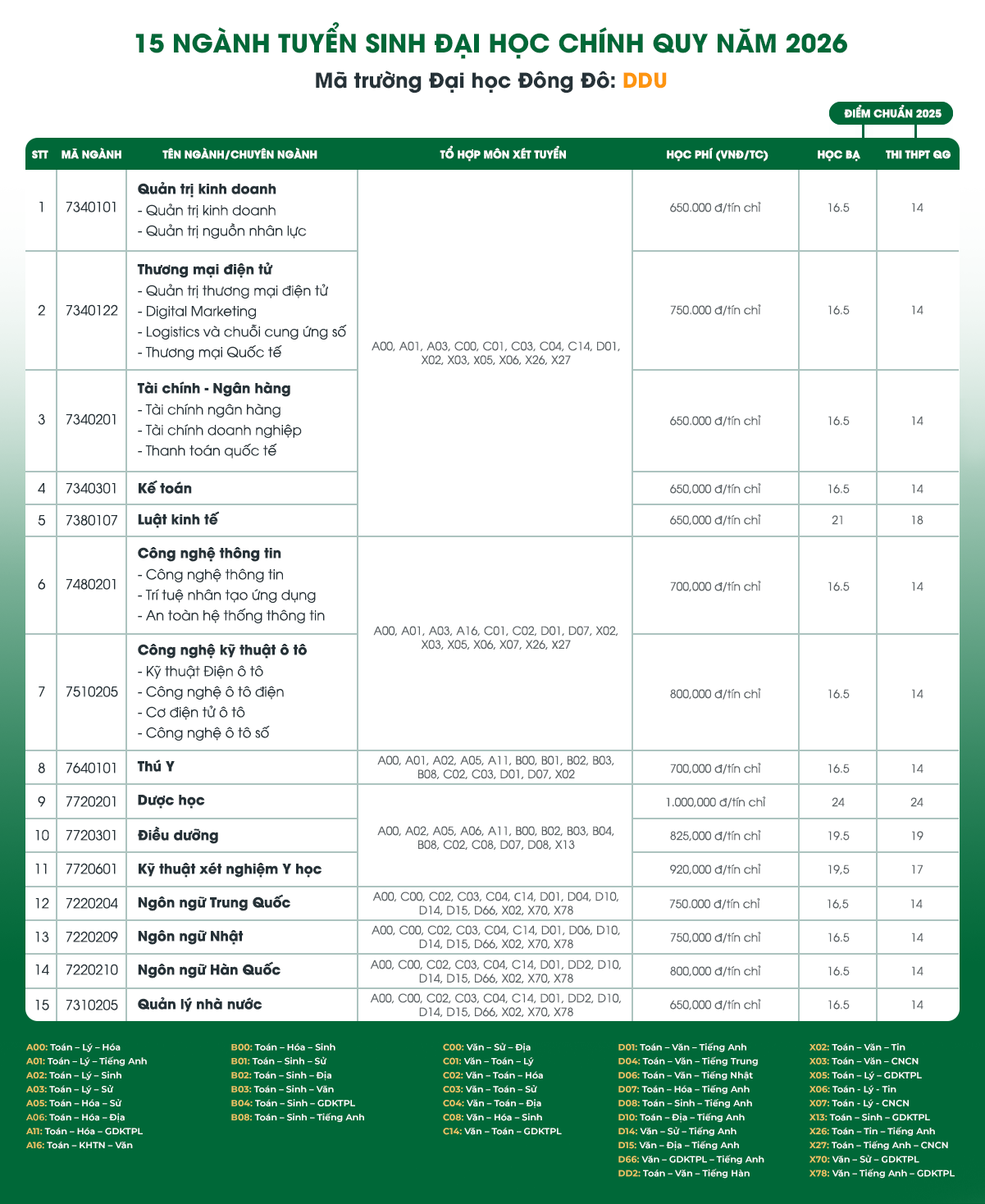 Chi tiết các ngành, tổ hợp xét tuyển và mức học phí cho khóa tuyển sinh năm 2026:
